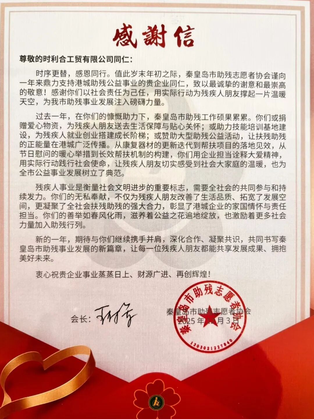 12月3日,秦皇島市“秦心共融 益起歡歌”世界殘疾人日公益聯(lián)歡會(huì)順利舉辦。我司董事長、秦皇島市助殘志愿者協(xié)會(huì)會(huì)長王付軍全程參與,和各界愛心人士一起為殘障群體發(fā)聲,助力助殘事業(yè)。